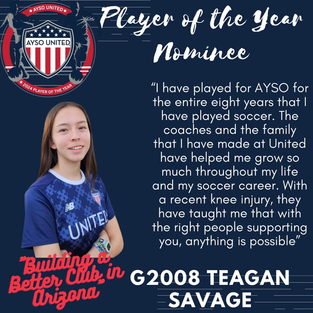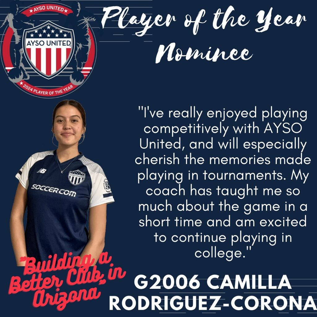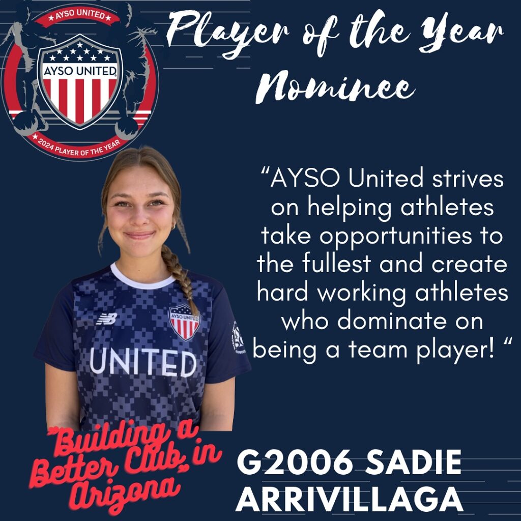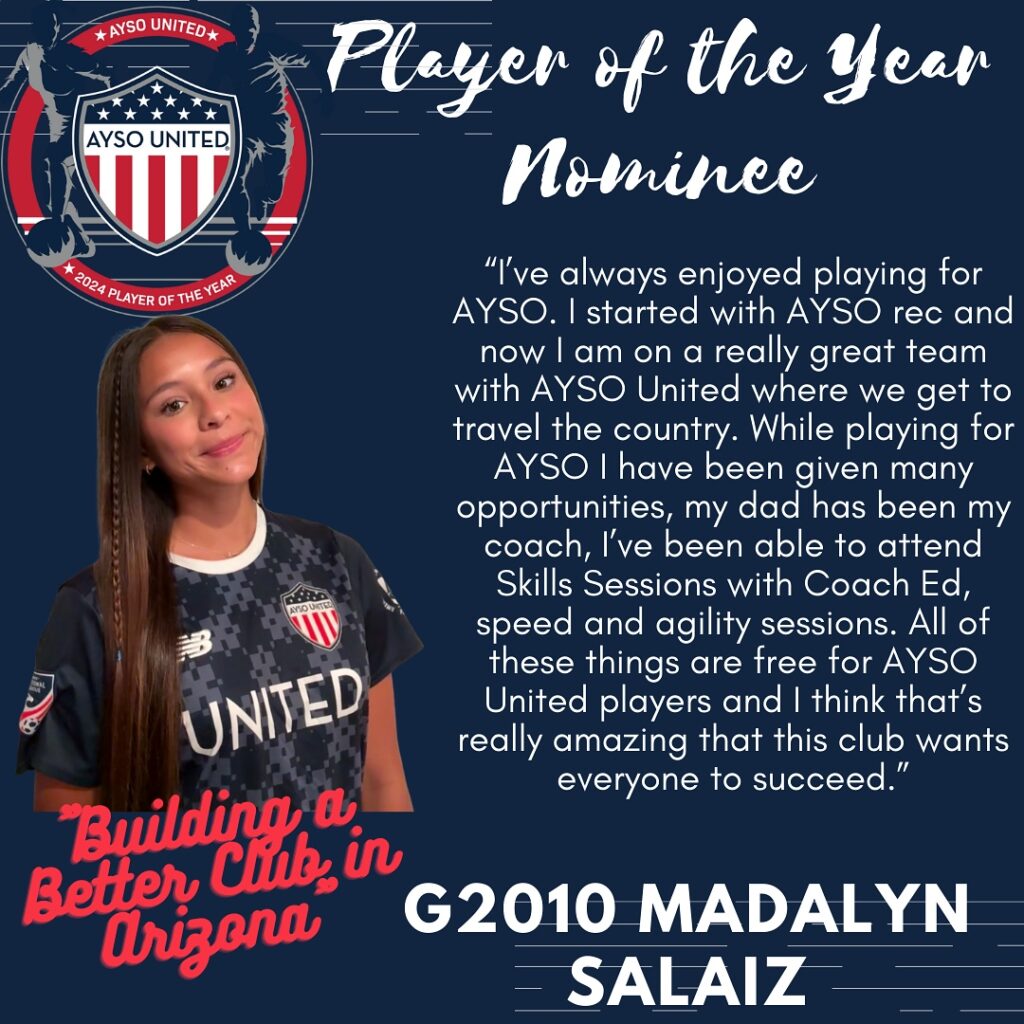 AYSO United is excited to present this year’s nominees for Player of the Year. The Player of the Year program is designed to celebrate young men and women who have demonstrated characteristics consistent with the philosophies of the AYSO United program. The candidates are being recognized not only for their prowess on the soccer pitch but their contributions off the pitch as well. The candidates will be judged on their performance in academics, civic responsibility, and volunteerism. Please join us in honoring these excellent young men and women who are already making our communities a better place to live. One final candidate will be submitted as Arizona’s nomination for the AYSO United National Player of the Year honor. *Players listed in no particular order*