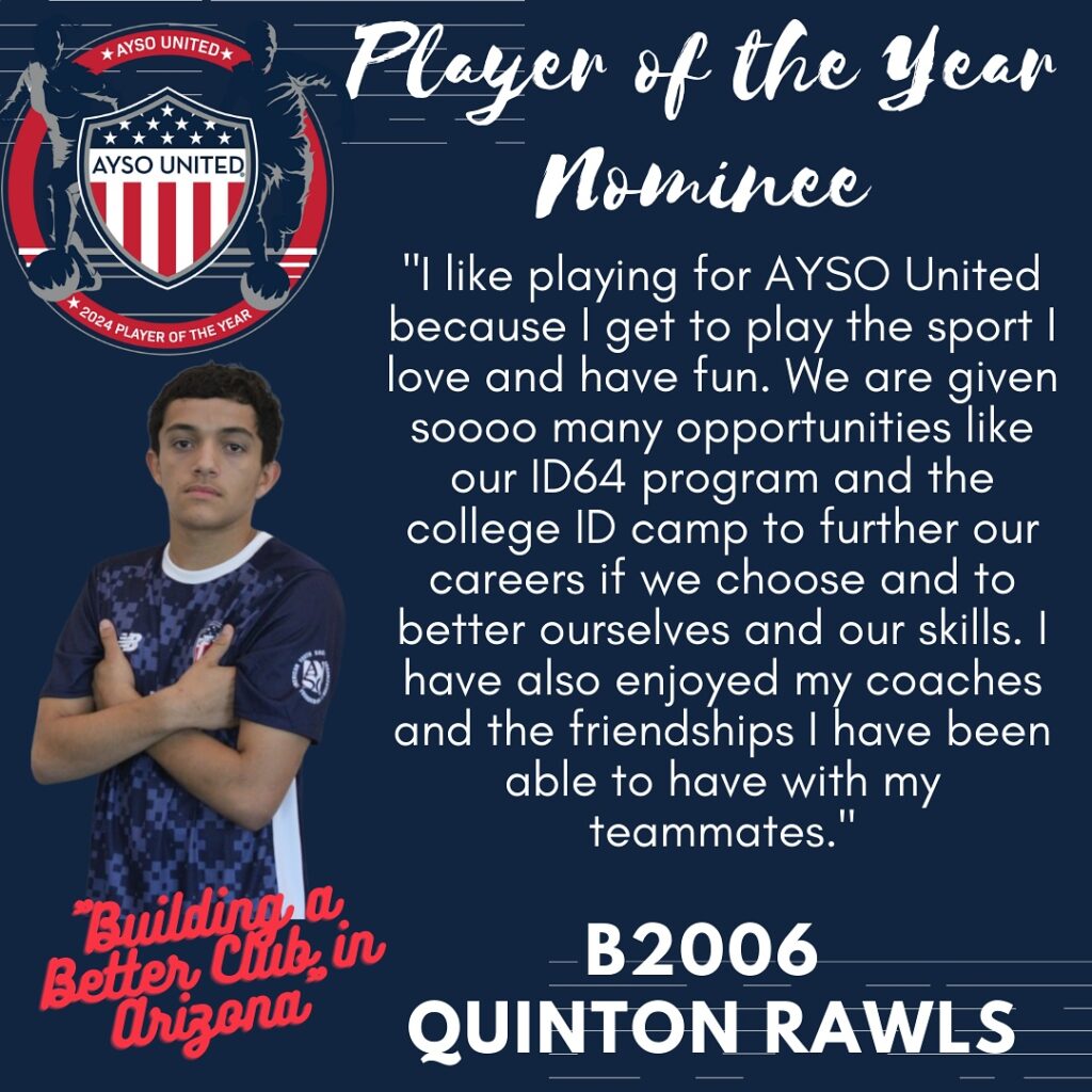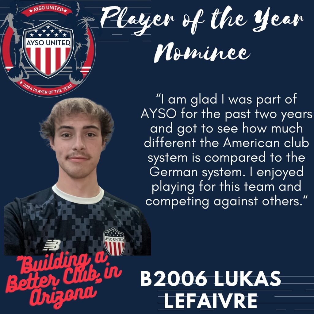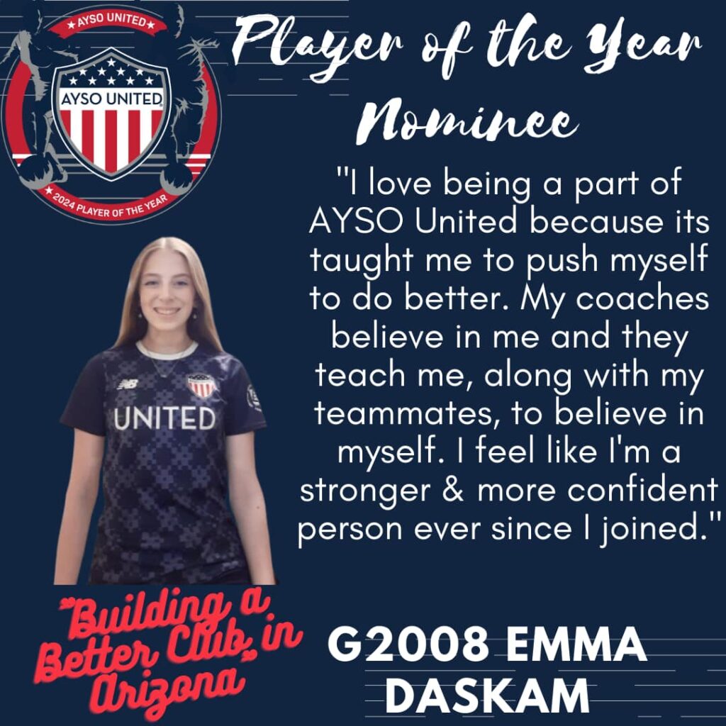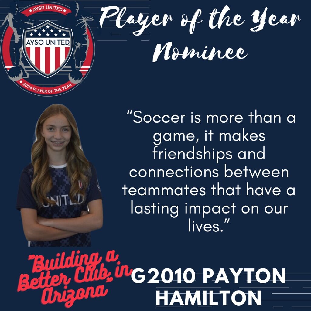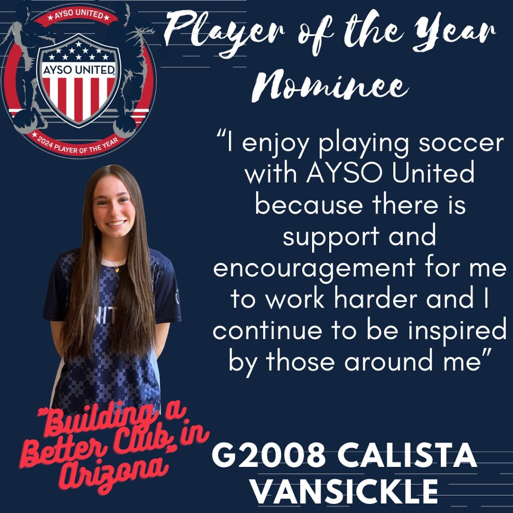 AYSO United is excited to present this year’s nominees for Player of the Year. The Player of the Year program is designed to celebrate young men and women who have demonstrated characteristics consistent with the philosophies of the AYSO United program. The candidates are being recognized not only for their prowess on the soccer pitch but their contributions off the pitch as well. The candidates will be judged on their performance in academics, civic responsibility, and volunteerism. Please join us in honoring these excellent young men and women who are already making our communities a better place to live. One final candidate will be submitted as Arizona’s nomination for the AYSO United National Player of the Year honor. *Players listed in no particular order*